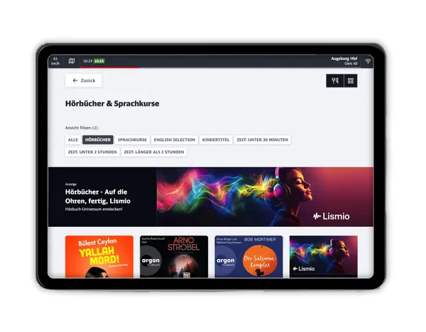 Unsere erfolgreiche Kooperation mit der Deutschen Bahn macht dieses besondere Angebot möglich – und im ICE Portal findest du direkt den Link zu unsere Marketing-Plattform Lismio, um noch mehr Hörbuch-Vielfalt kennenzulernen. Seit Dezember ist Lismio dadurch noch sichtbarer, und zwar in der gesamten ICE Flotte!